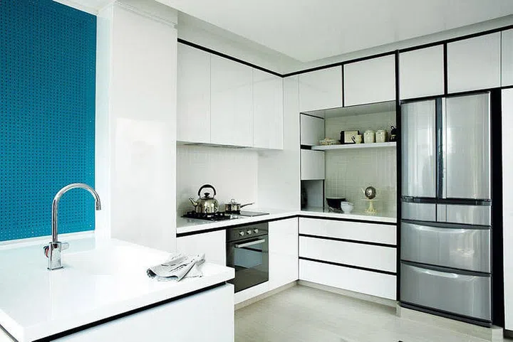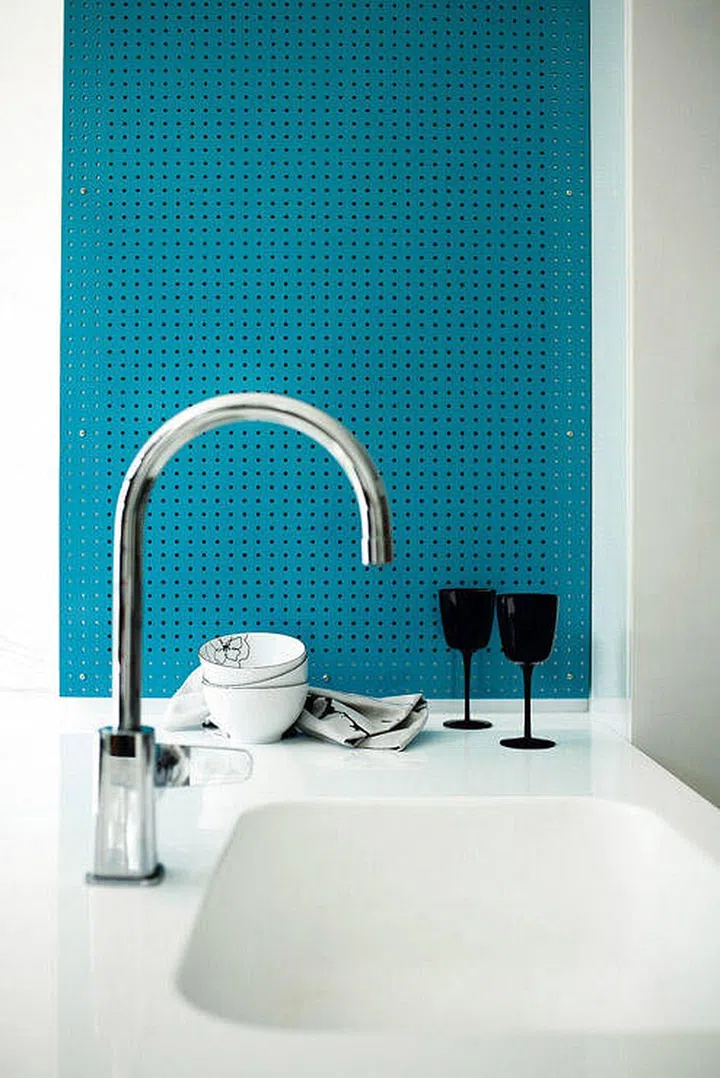 The powder-coated aluminium panel is a point of visual interest in the pristine kitchen.