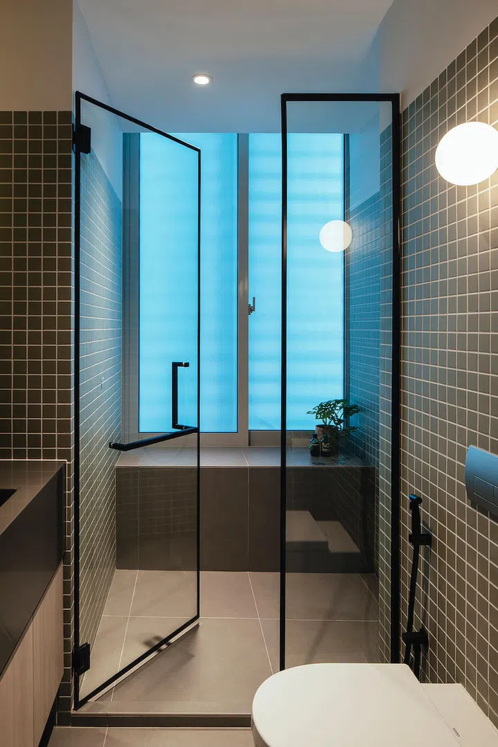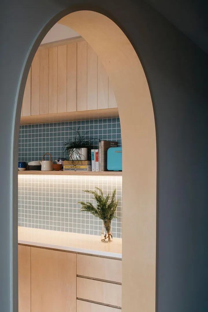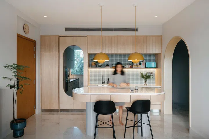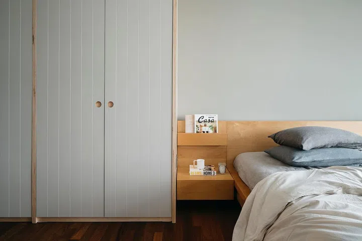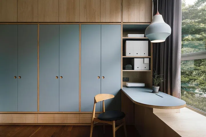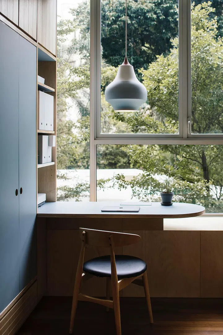 The cool tones are also well- balanced with the use of plywood throughout the house, which lends warmth while keeping the whole look visually bright and spacious. The light blond engineered wood features mainly in the kitchen cabinets, the island counter, an archway, the shelving in the study and the wardrobe in the master bedroom.