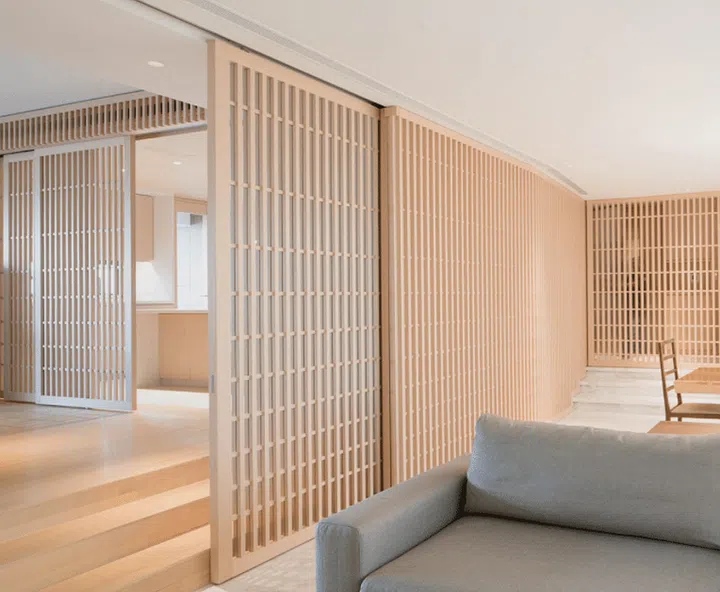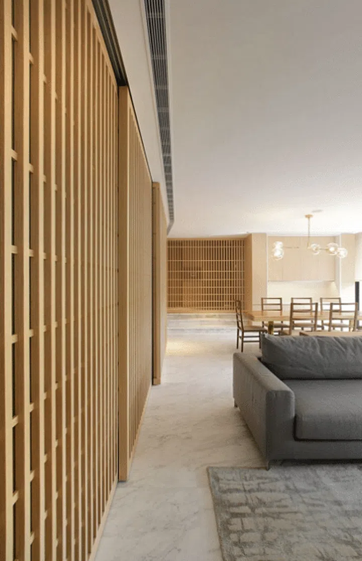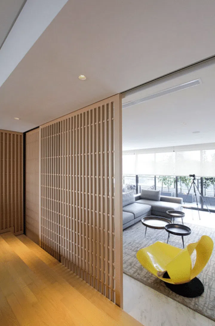 Sliding wooden screens are used to segment the spaces, acting as doors to close off the areas when necessary. The seamless look of the doors to the walls make the room feel larger and more spacious.