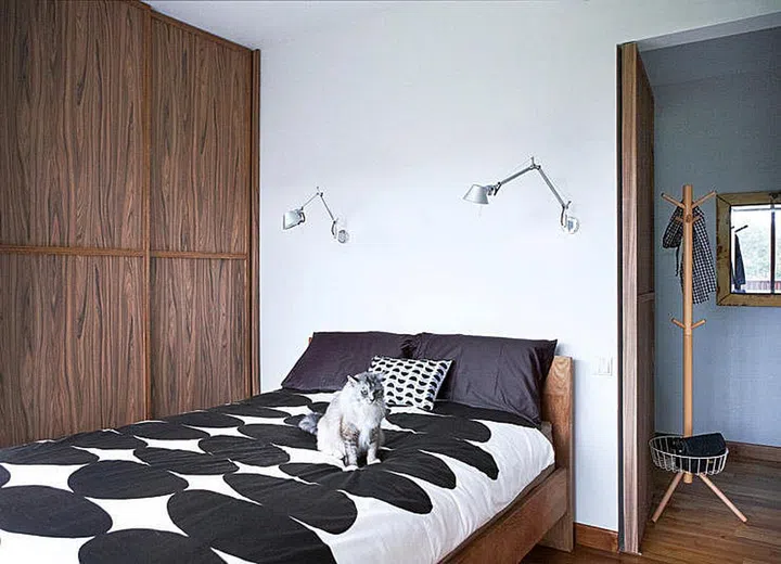 The master bedroom exemplifies smart space utilization with wall-mounted reading lights that free up precious surface area. This thoughtful approach to lighting design maintains the clean lines of the loft-style interior while creating a cozy atmosphere for both humans and cats alike.