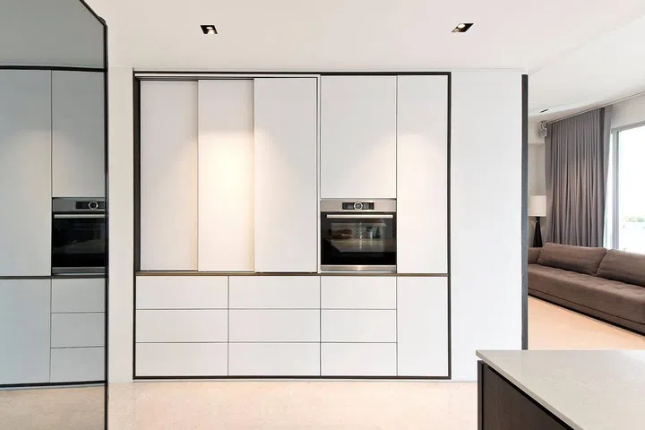 In order to create ample space in the open kitchen, the interior designers also created an entire wall of built-in cabinets.