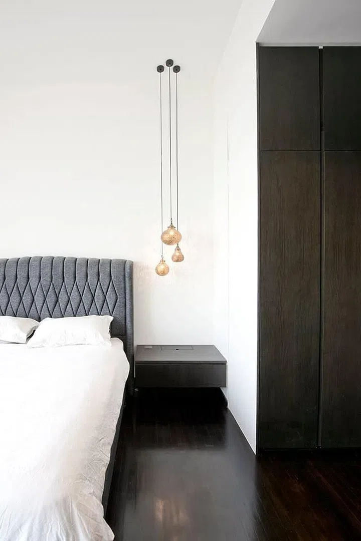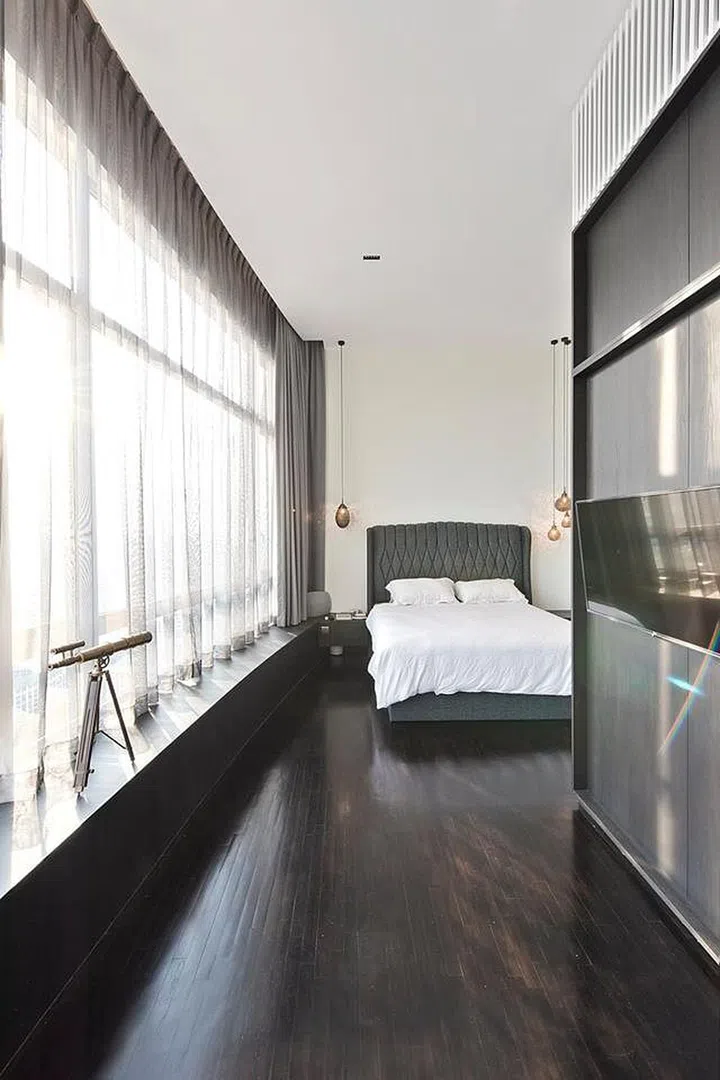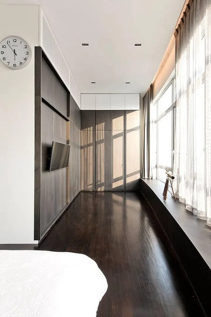 The wall along the master bedroom was designed to include a swivel TV wall that can be swivelled to face the bed at night.