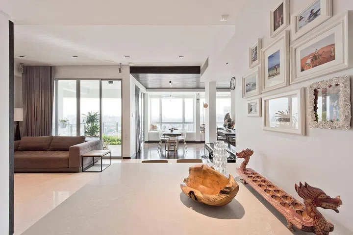And while the rest of the home is designed in line with the white theme, colourful artworks on the walls help to add vibrance to the spaces.