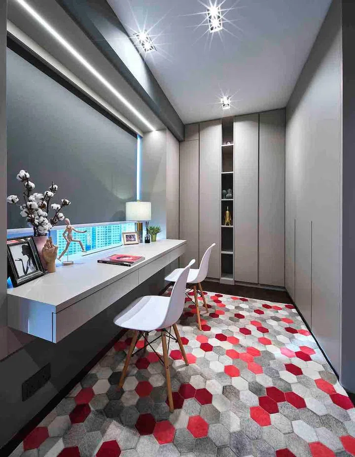 As the family wanted the two daughters to share a room, Adrian proposed combining two bedrooms to form a larger room for the kids. A platform bed with a cabinet in the centre offers plenty of storage possibilities, while the bright orange headboards and hexagonal pattern of the carpet lend a fun and playful vibe.