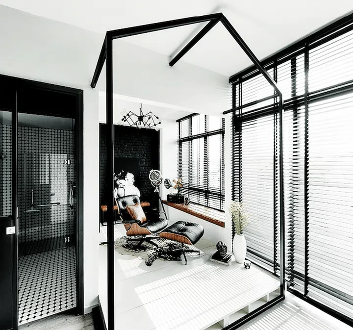 To make a bold design statement, she built a frame that accentuates the ceiling height in the living room. The structure leads to a cosy corner that sits on a platform.