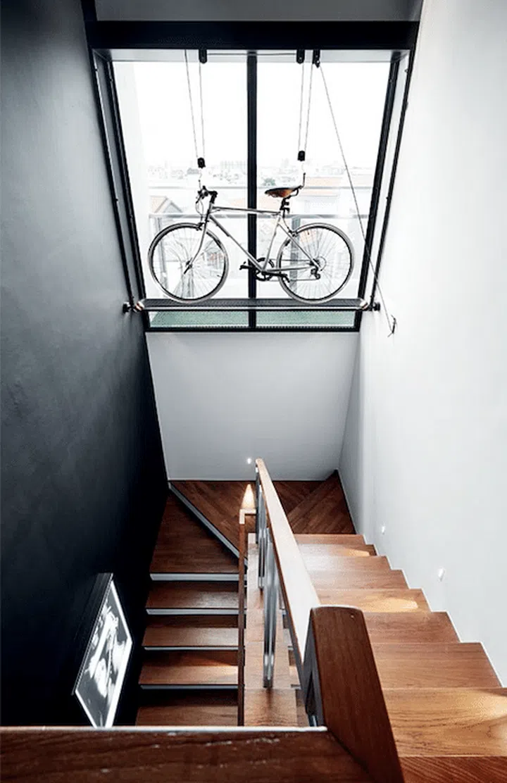 When not in use, the bike can be hauled up with a manual pulley system and showcased.