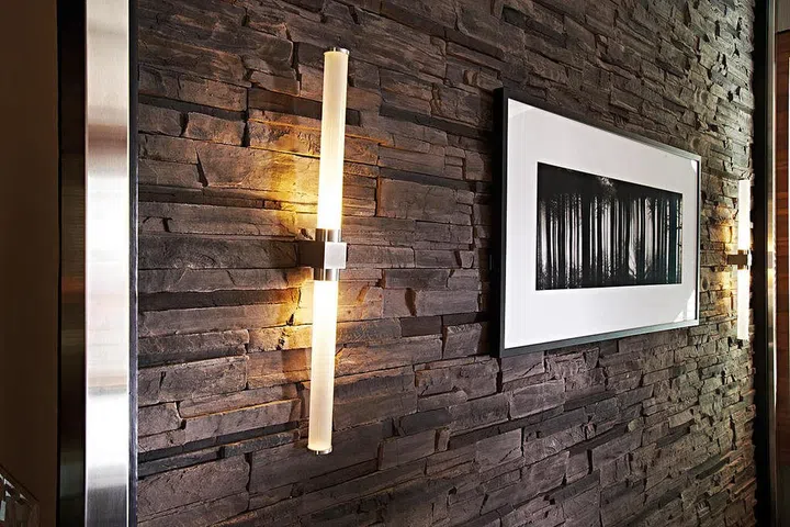 Tube-shaped lights mounted on the feature wall match the lighting above the TV console opposite.