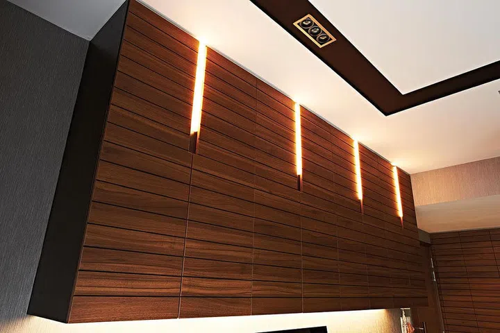 Lighting tubes are integrated in the built-in cabinets above the TV console for ambient mood illumination.