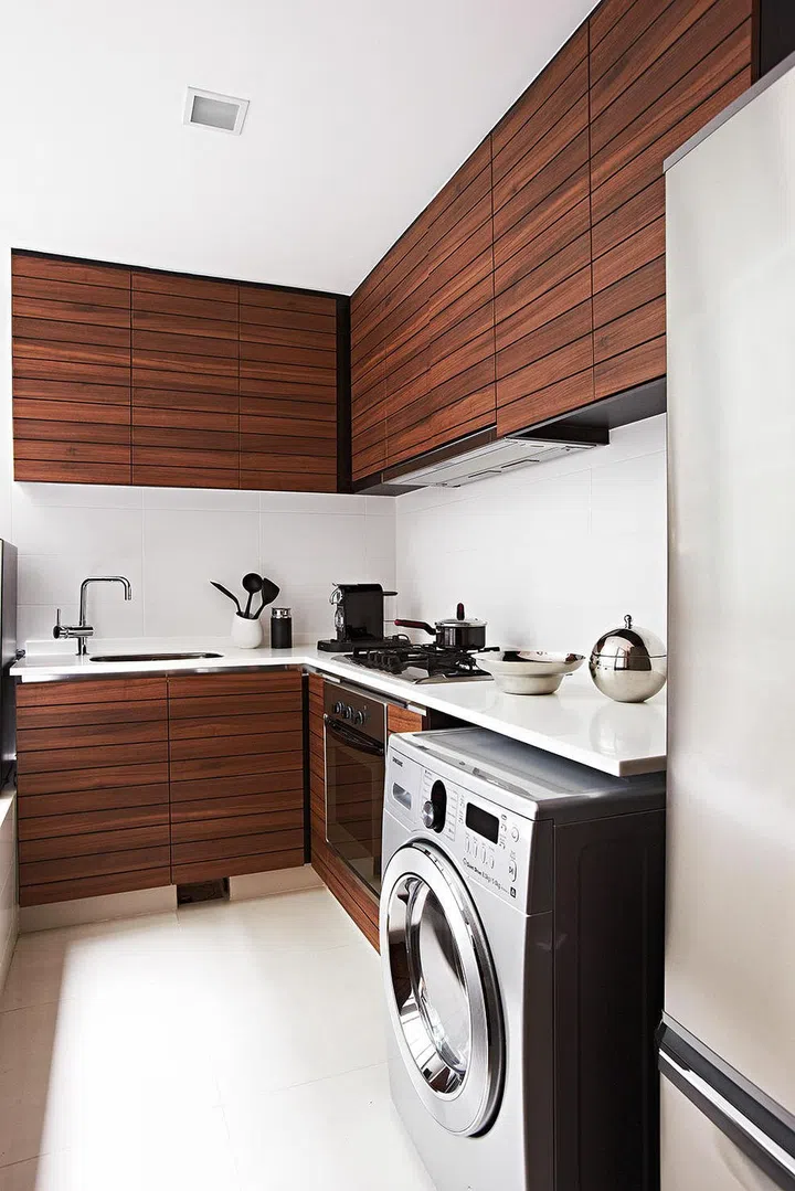 To maintain design unity with the rest of the home, the original built-in kitchen cabinets are clad in wood laminate.