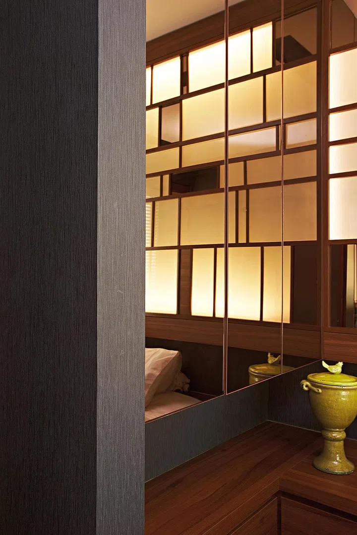 These built-in cabinets in the master bedroom are clad in mirrors to reflect light from the windows and lighting feature wall.