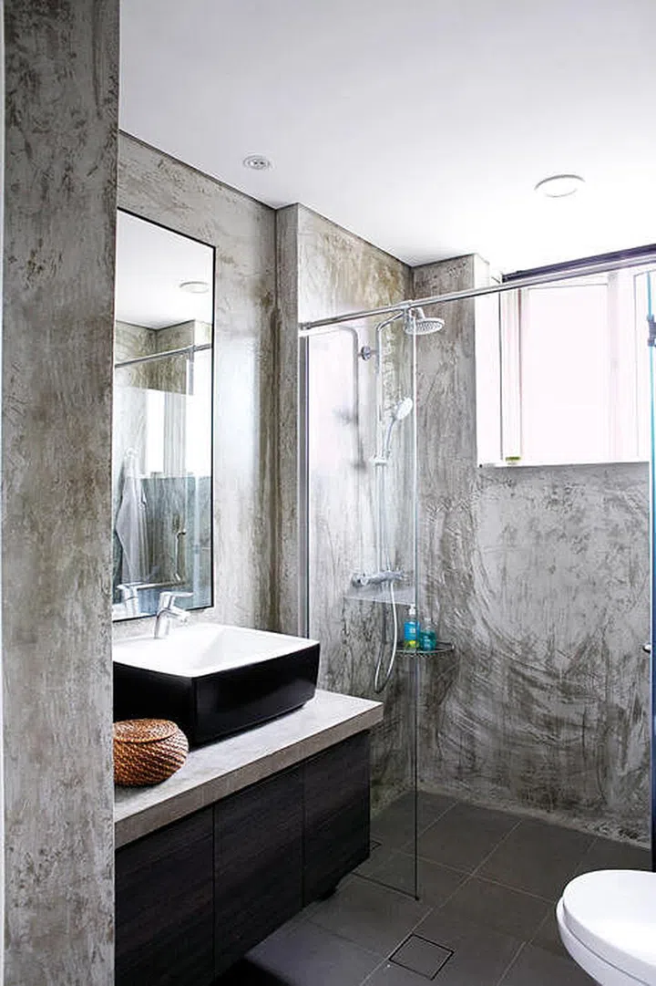 The cement screed walls in the bathroom were coated with a water-resistant finish for easy maintenance.