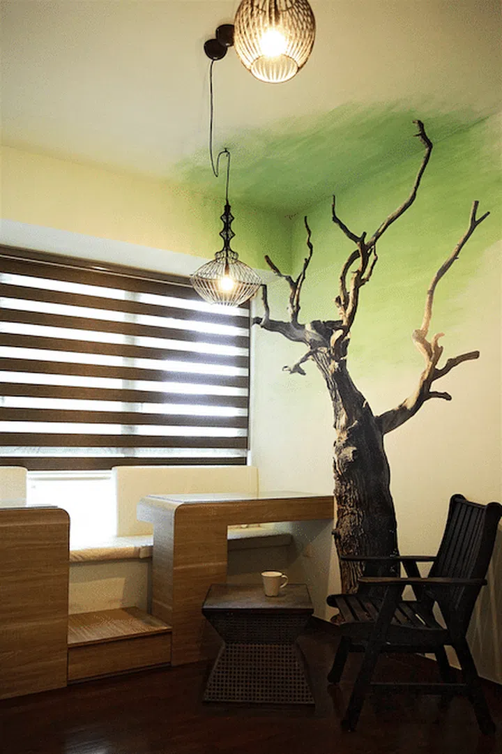 Bird cage lights from Singapore lighting store Eurostar Lightings and Furnishing hang from the ceiling, while elements such as a splash of green paint on the ceiling and a large tree wall decal add to the nature theme.