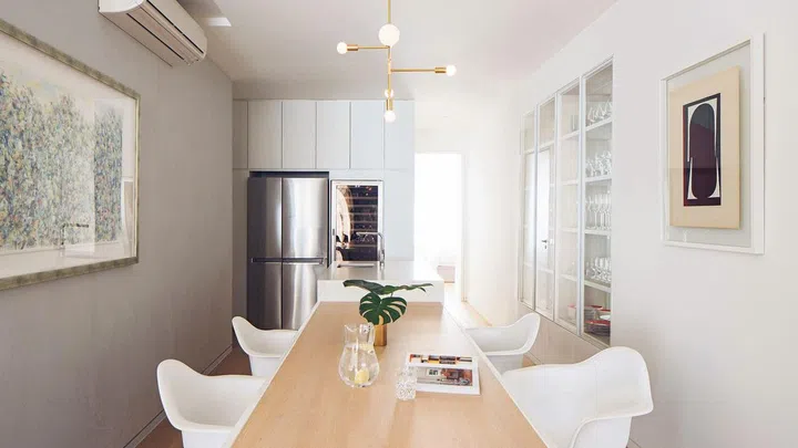 On the opposite side is a white wall that runs the entire length visually connecting the dining to the master bedroom at the back.