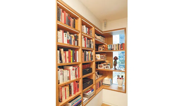 For example, bookshelves were installed at the bay windows in the lounge area, where the couple display their collection of books and other personal items.