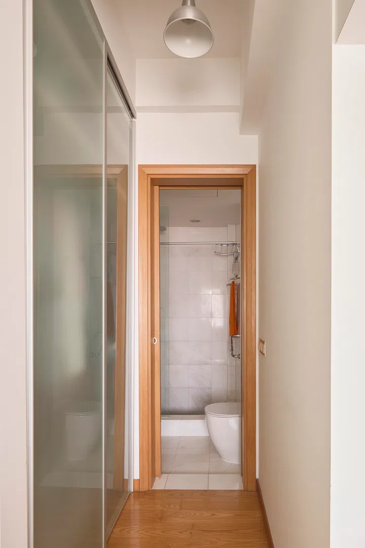 A compact corridor leads from the bedroom to the bathroom, featuring an integrated wardrobe which keeps storage and circulation neatly contained.