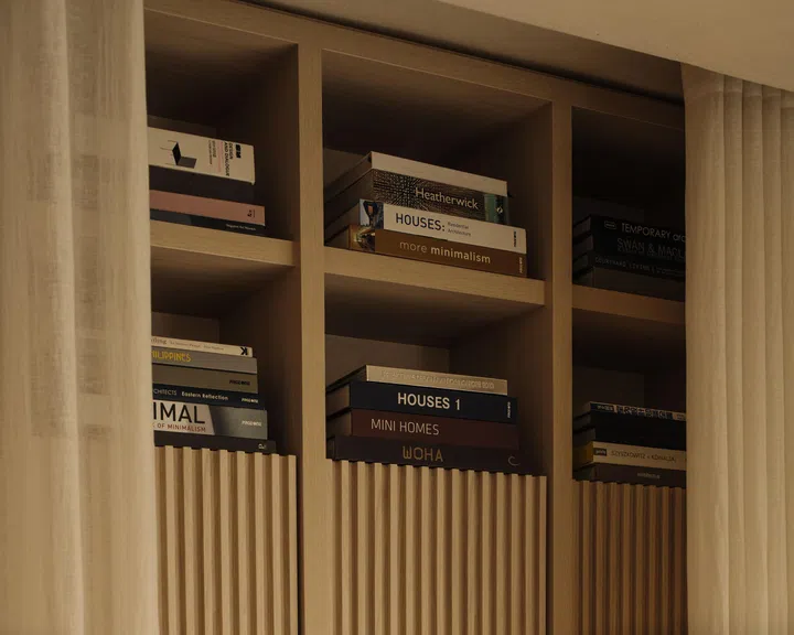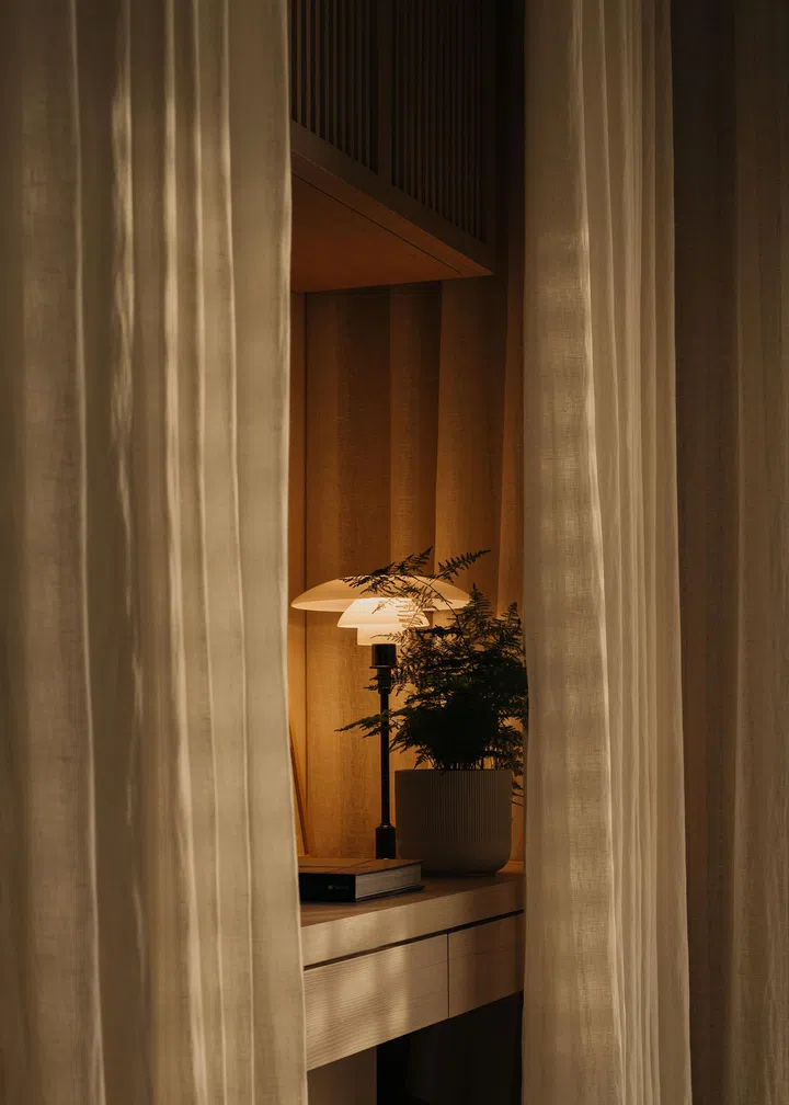 Commissioned by interior designer Darren Tee, the bookshelf fits neatly between the curtain and the glazing, providing a discreet spot for displaying plants and smaller books. This placement creates an interplay of light and shadow, with plant silhouettes softly casting onto the linen curtain, shifting subtly as the curtain moves.