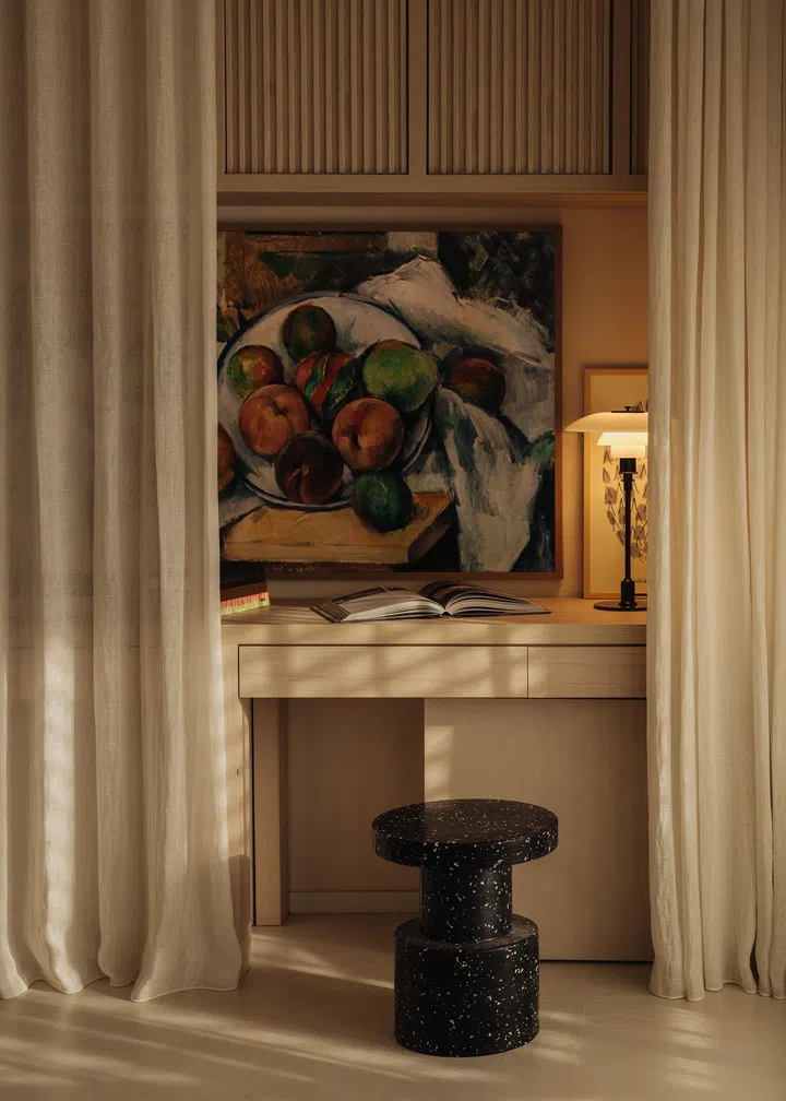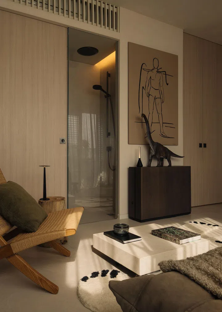 A striking black bench, custom-made by interior designer Darren Ree from repurposed railway sleepers, anchors the space. It pairs with a sleek wall-mounted mirror in slim black frames, creating a bold contrast against the all-beige backdrop. A small artwork by Malaysian artist Sherwan Rozan, also in shades of beige and black, adds a personal touch.