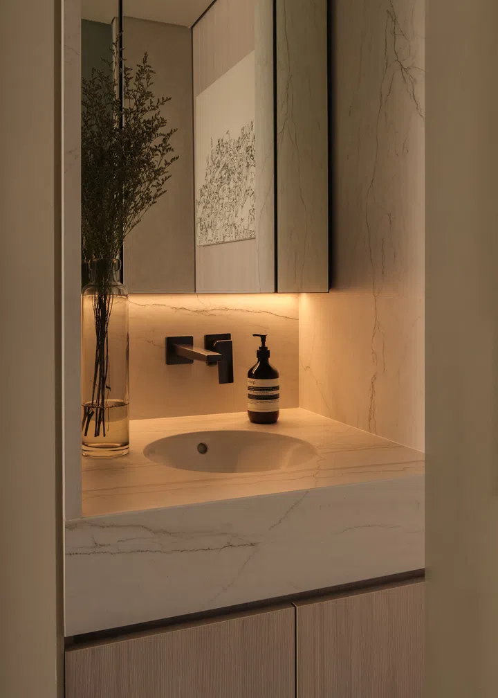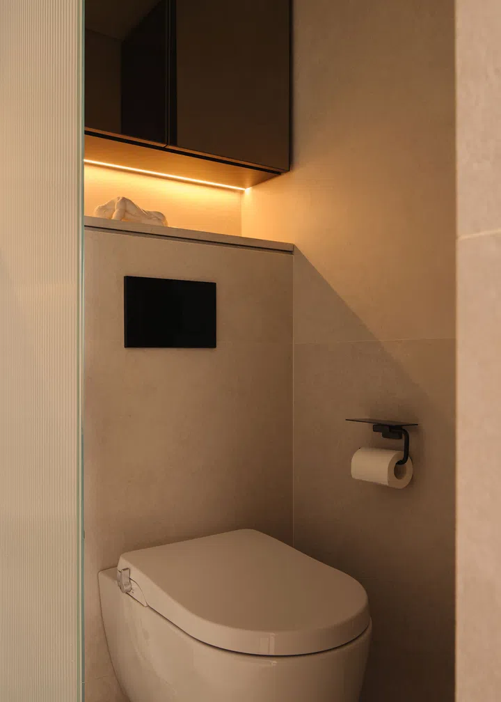 The design includes hidden storage solutions to maximize every inch of the space. A flush full-length mirror in the toilet compartment discreetly conceals spare toiletries, while a deeper storage area is cleverly tucked behind the wardrobe, making use of an otherwise unused space to store larger items.