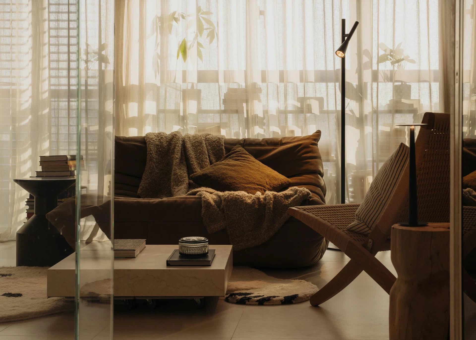 At the end of the kitchen, a pair of sliding pocket doors opens to reveal the living room, reimagined as a spacious area by merging the original living room with an adjacent bedroom. Linen curtains drape elegantly along the external wall, covering the full-length windows while also cleverly concealing the TV and bookshelves. This adds a playful element and hides clutter when needed.