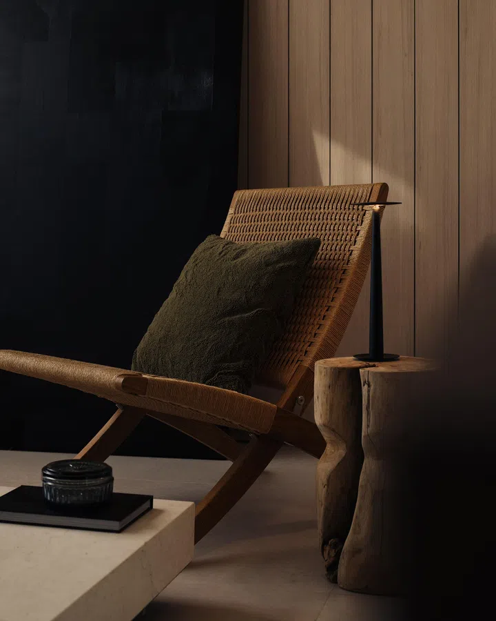 It pairs with the foldable Cuba Lounge Chair by Carl Hansen & Son, crafted in oak and natural cord, alongside a custom beige marble coffee table on hidden rollers designed by Darren. This setup allows the entire arrangement to be easily moved and adjusted, ensuring the space remains dynamic and adaptable to changing uses and preferences.