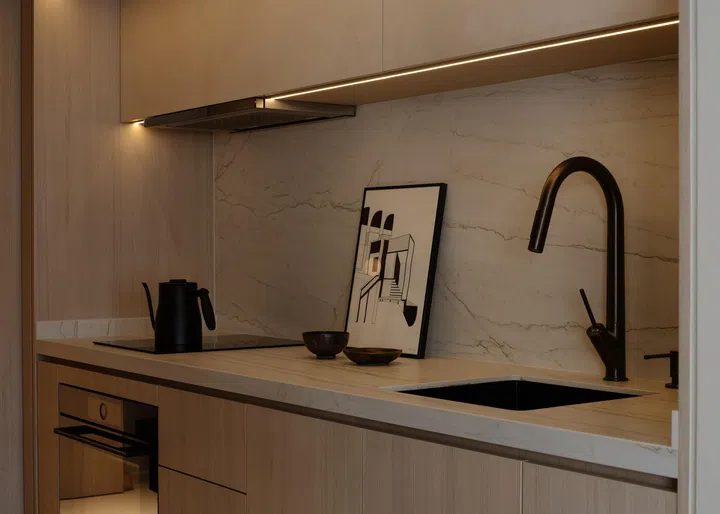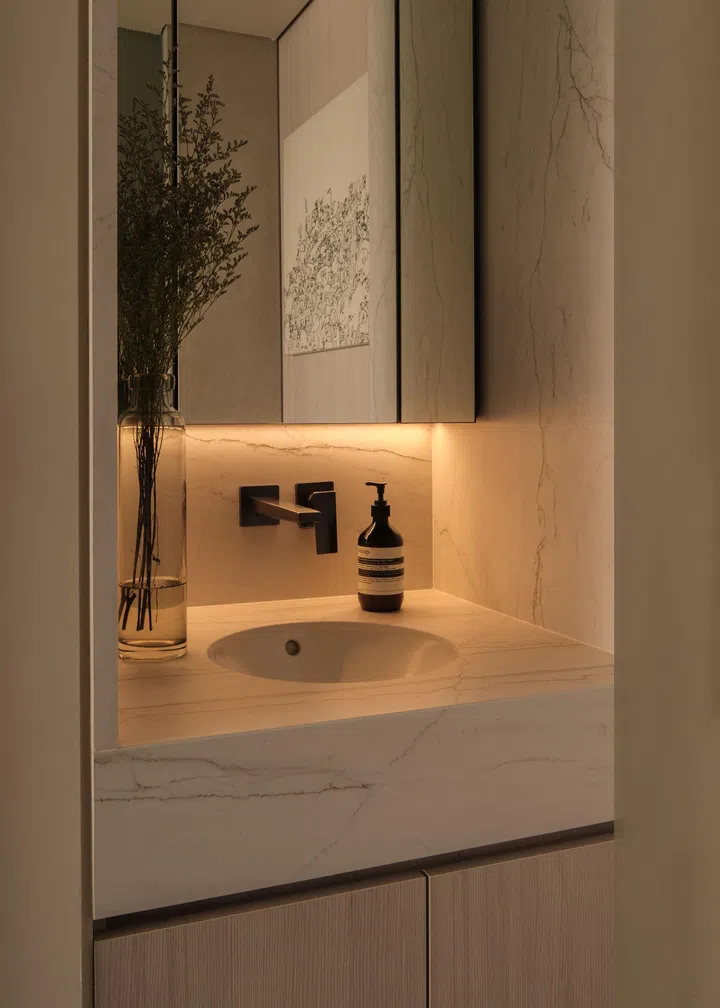 To counter the common negative perception of entering a unit through the kitchen, all functional elements are carefully concealed. Integrated appliances, such as the fridge, freezer, dishwasher, and microwave, are seamlessly hidden to create a clean, streamlined look.