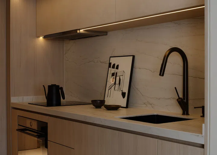 To counter the common negative perception of entering a unit through the kitchen, all functional elements are carefully concealed. Integrated appliances, such as the fridge, freezer, dishwasher, and microwave, are seamlessly hidden to create a clean, streamlined look. Everyday items like chopping boards, kitchen towels, dish drying racks, cooking recipes, and cutting boards are stored in dedicated hidden compartments, keeping countertops clutter-free. This design approach enables the owner to effortlessly maintain a tidy kitchen, with daily necessities tucked away and only decorative items on display, ensuring a polished appearance at all times.