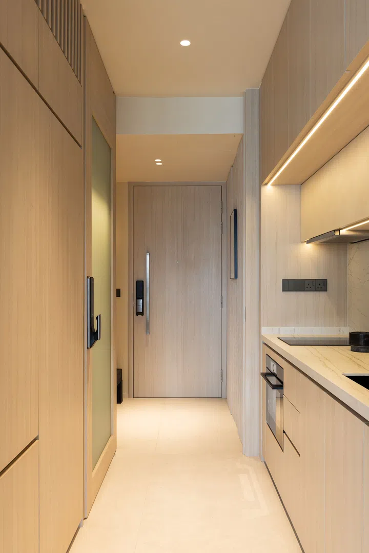 Stepping into the main entrance, one is greeted by a compact, all-beige foyer. Full-height woodgrain fluted panels conceal the storage, distribution board cabinet, and the door to the second wing. This creates a seamless and minimalist aesthetic. Unlike typical dual-key foyers, which often lack natural light, this space features a large pivot door with frosted and fluted glass panels. Daylight filters through from the living room and kitchen, softly illuminating the foyer even when the doors are closed. The flooring is finished with large-format beige Italian tiles. This detail creates a seamless visual flow that unites the walls, ceiling, and floor, enhancing the unit’s cohesive look.