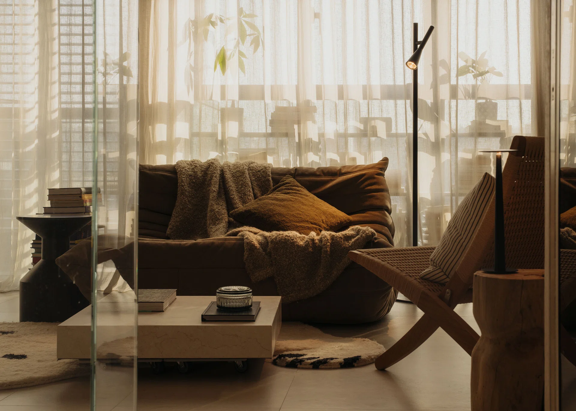 Hidden behind the linen curtain is a custom low black bookshelf by local furniture maker Studio Kallang, featuring their signature wood-turned beaded supports inspired by the local dessert Onde Onde. Commissioned by interior designer Darren Tee, the bookshelf fits neatly between the curtain and the glazing, providing a discreet spot for displaying plants and smaller books. This placement creates an interplay of light and shadow, with plant silhouettes softly casting onto the linen curtain, shifting subtly as the curtain moves.
