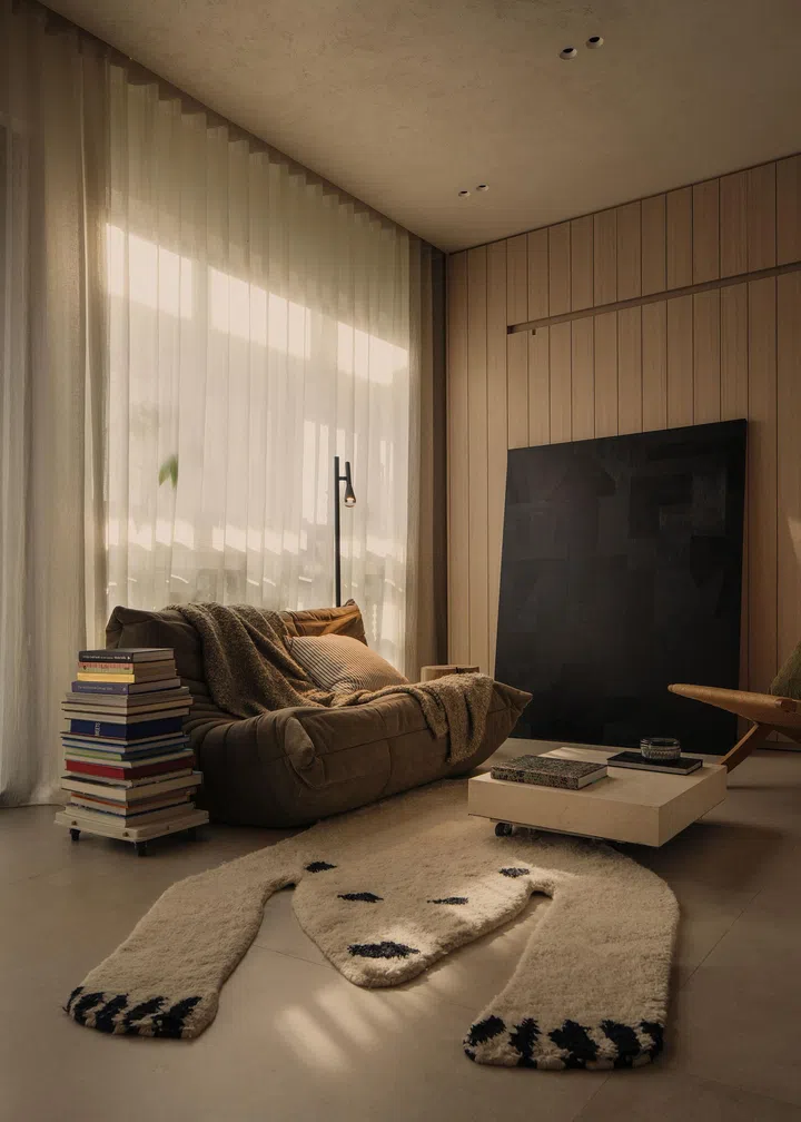 The design language flows seamlessly from the foyer and kitchen into the living room with the same large-format beige floor tiles. Walls and ceilings are finished with cement-textured paint in a soft Plaster of Paris shade, featuring travertine-like pinholes for added texture and warmth. Light oak woodgrain carpentry frames the space, with a TV wall and bookshelves on one side and full-height hidden storage on the other, enhancing the cohesive design.