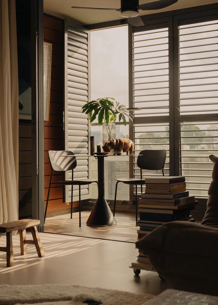 The living room extends to a balcony that doubles as a dining area for two to four people. This space can be enclosed with full-height operable louvered screens, enhancing privacy and comfort. An abstract tree artwork by young Singapore-based artist Karina Simon adds a refreshing green accent to the balcony, perfectly complementing the outdoor setting.