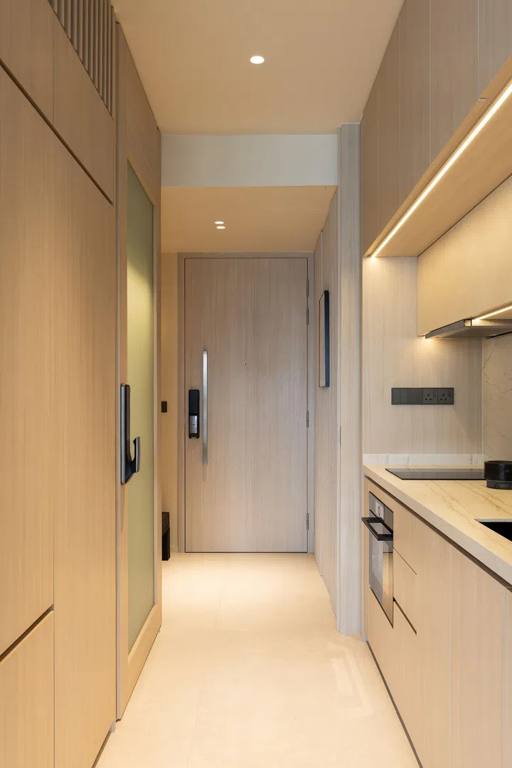 Stepping into the main entrance, one is greeted by a compact, all-beige foyer. Full-height woodgrain fluted panels conceal the storage, distribution board cabinet, and the door to the second wing. This creates a seamless and minimalist aesthetic.