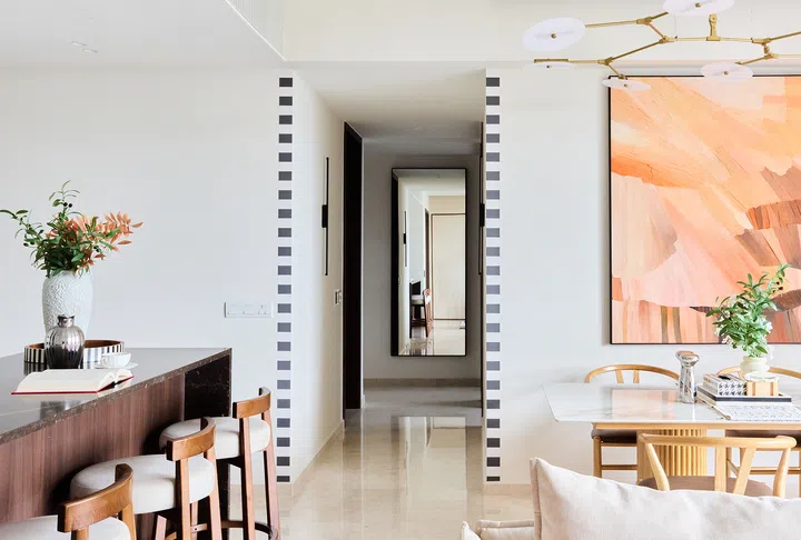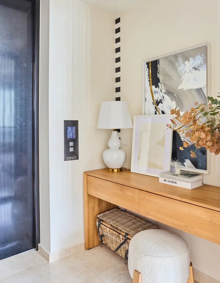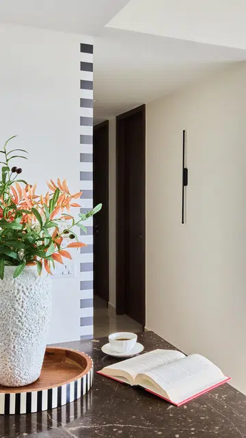 As explained by interior designer Ankita, the concept given to this home was dynamic minimalism. It embraces the core principles of minimalism while incorporating elements that create a sense of movement and energy within a space. The experience begins as one steps out to the private lift lobby. Here, a console holding daily essentials is decorated tastefully to evoke a sense of calm and ease. She introduced striped wallpaper at the edges of the wall to bring dynamism and movement.