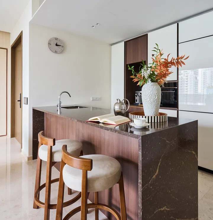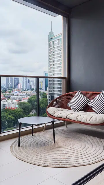 The dry kitchen is equipped with a peninsula that can serve as a breakfast counter. A small washing area offers everyday convenience. The apartment has a balcony, which the interior design team has furnished for integration with the living space. Lounge seating for two is available, perfect for lounging with a good read.