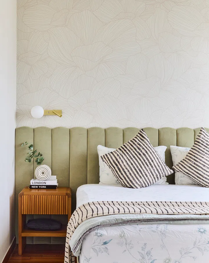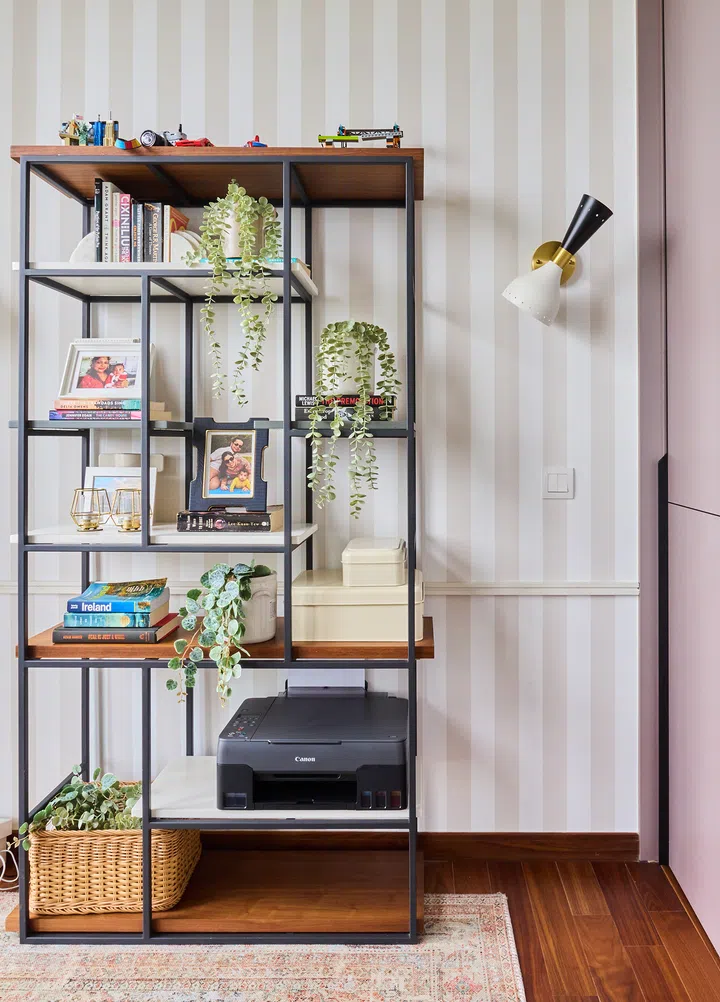 The master bedroom is a picture of calm with its customised headboard in soft green and delicate wallpaper design. This restful environment is equipped with bedside tables for their current reads. The couple turned another bedroom into a study, with a shelving unit to house collectables, plants, office equipment and more books. The striped wallpaper makes an appearance here too.