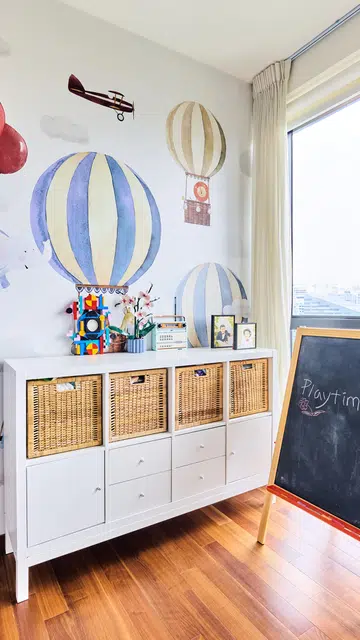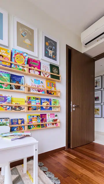 Both avid readers, the couple designed their child’s bedroom in a way that inculcates this habit. Wall-mounted shelves keep books within sight and free up the floor space. In addition to the colourful books, there are illustrations depicting words of affirmation. A mood-lifting customised wallpaper brightens up the bedroom. This room is currently a playroom as the child sleeps with the couple.