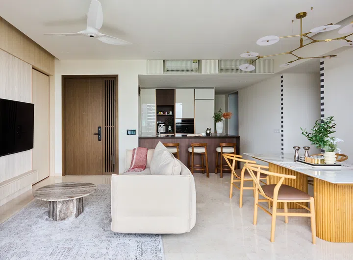 Delving deeper into their brief, interior designer Ankita learnt that the family leads a simple lifestyle. They preferred a functional and aesthetically pleasing home. They aimed to focus on necessary elements without excessive decoration. “Our goal for them was to create a minimal yet effective and efficient space, harmonising with their lifestyle,” she says. “Since it was a new unit, there wasn’t much need to re-layout or demolish anything.”