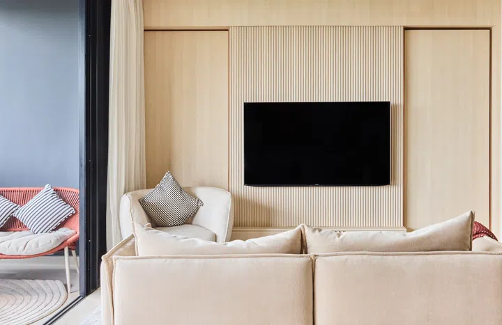 The striped wallpaper detail recurs in the living area, framing the passageway to the bedroom. As it is a compact living and dining space, the walls and custom television feature are kept light in colour.
