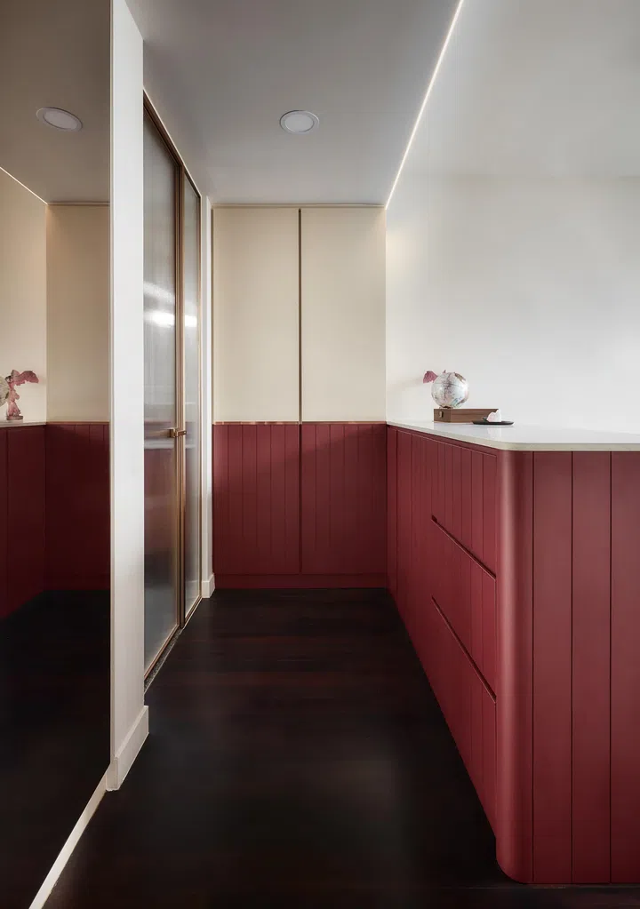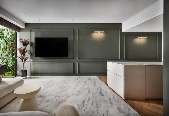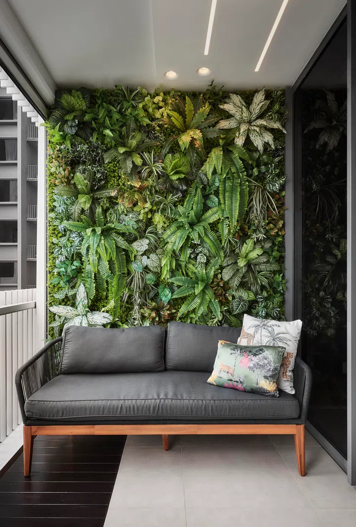 The existing balcony has been conceptualised into three different zones. The section adjacent to the living room is the balcony proper. It has a green wall that addresses Mel’s request for at least some greenery within the home. As she travels frequently for work, she opted for artificial plants to minimise maintenance.