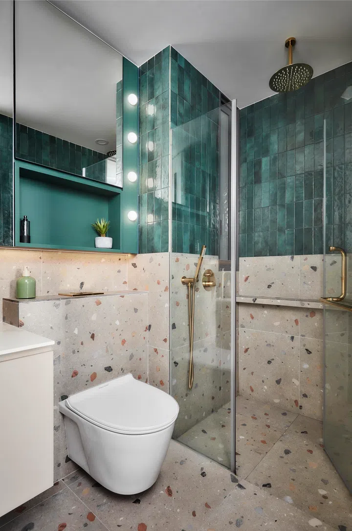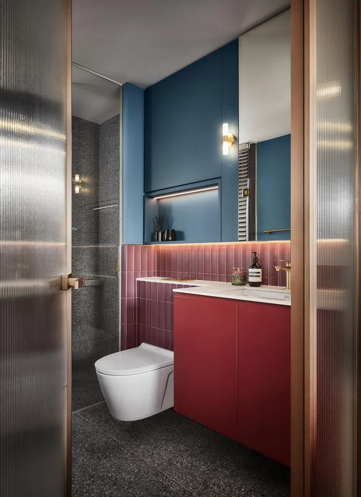 The high contrast colour schemes for the master bathroom and common bathroom inject a hint of vibrancy and energy into these compact spaces.