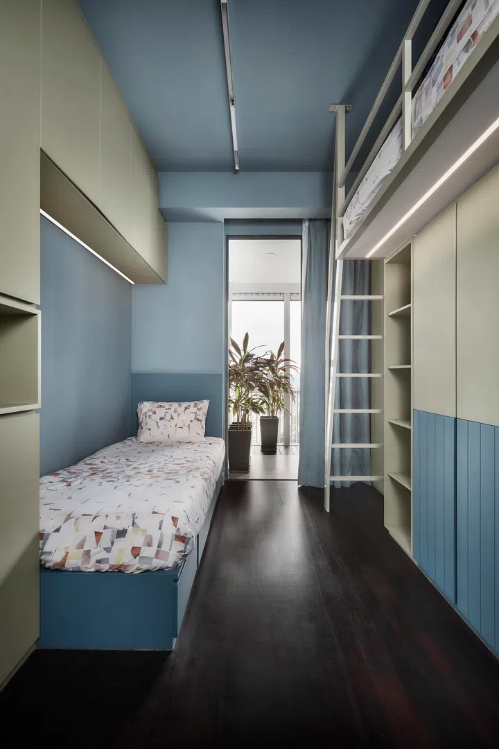 Interior designer Kelvin cleverly reconfigured the bedroom with one central walkway and two zones on either side - one has a loft bed above a wardrobe, taking advantage of the high ceiling, while the other has a bed below and storage above.