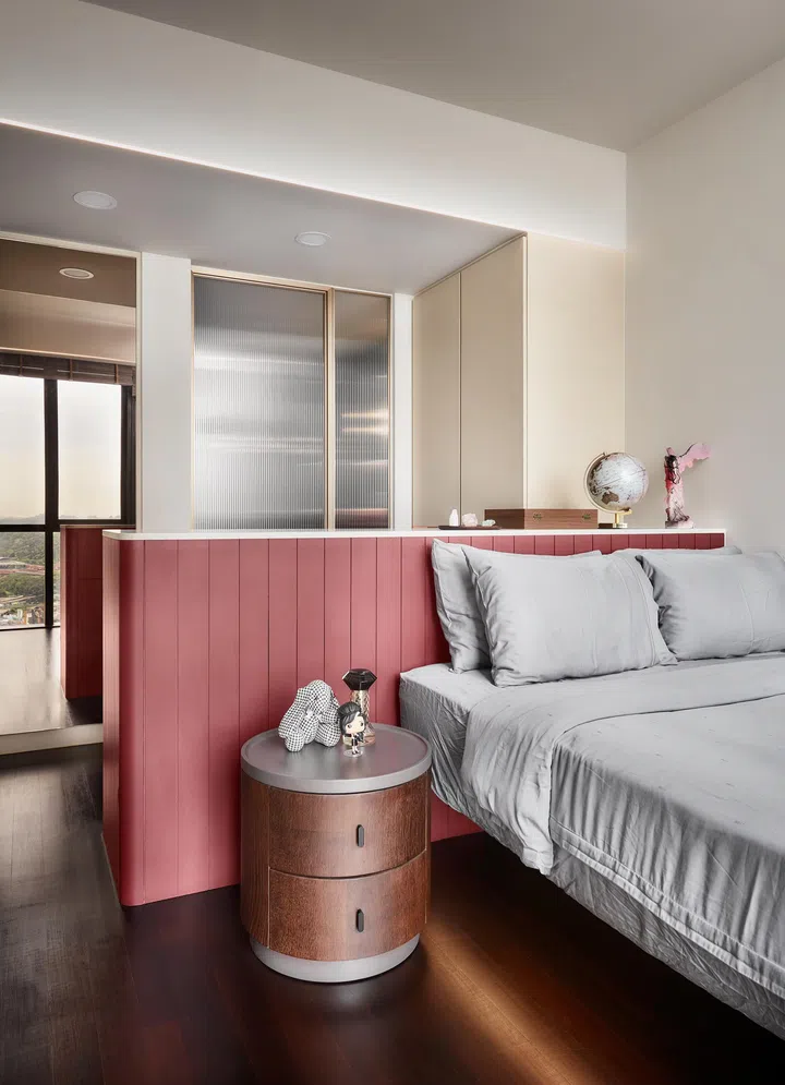 Interior design Kelvin introduced a low partition within the master bedroom, which serves as a vanity divider with additional storage. More importantly, this also doubles up as a headboard that allows the bed to face the floor-to-ceiling windows with a view of the surroundings from the apartment’s high floor.