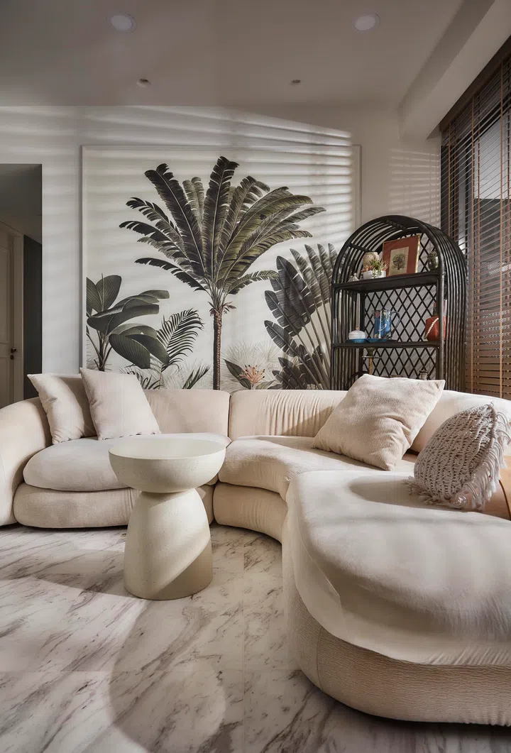 The beige and green colour palette reflects Mel’s preferences along with the wainscoting details on the walls. The wallpaper featuring tropical palm trees behind the sofa was also something that she fell in love with at first sight.
