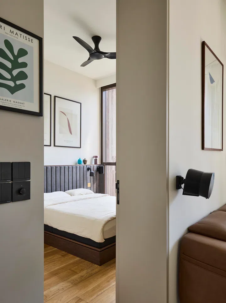 Two abstract prints adorn the wall above the bed. Most of the artworks within the home are of abstract prints and plants. WL chose them according to his personal preference and also to complement the interior in terms of shape and colour.