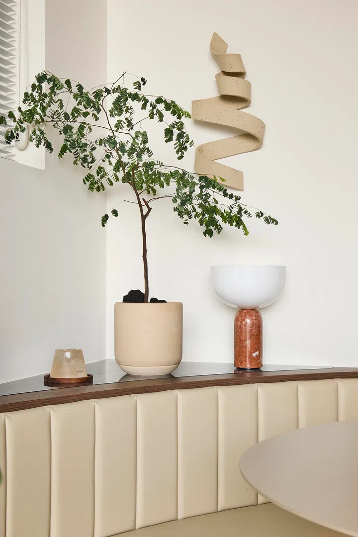 WL believes that art and plants bring a place to life. He chose three wall art pieces from Klay Copenhagen to enliven the dining area. Each unique piece is handmade using speckled clay and the wave-like forms inject the space with dynamism and fluidity.