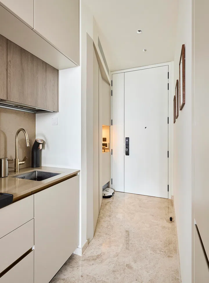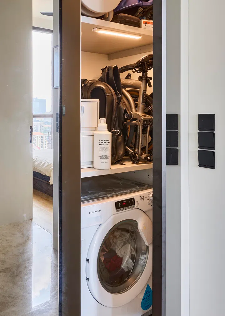 Artistroom added built-in cabinets along the wall next to the main entrance, angled so as not to encroach into the entrance foyer’s circulation space. They are cladded in grey laminates that match the existing kitchen cabinets. Each specific item gets its own designated storage space- from the cleaning robot and shoes to the vacuum cleaner, mop, ironing board and ladder.