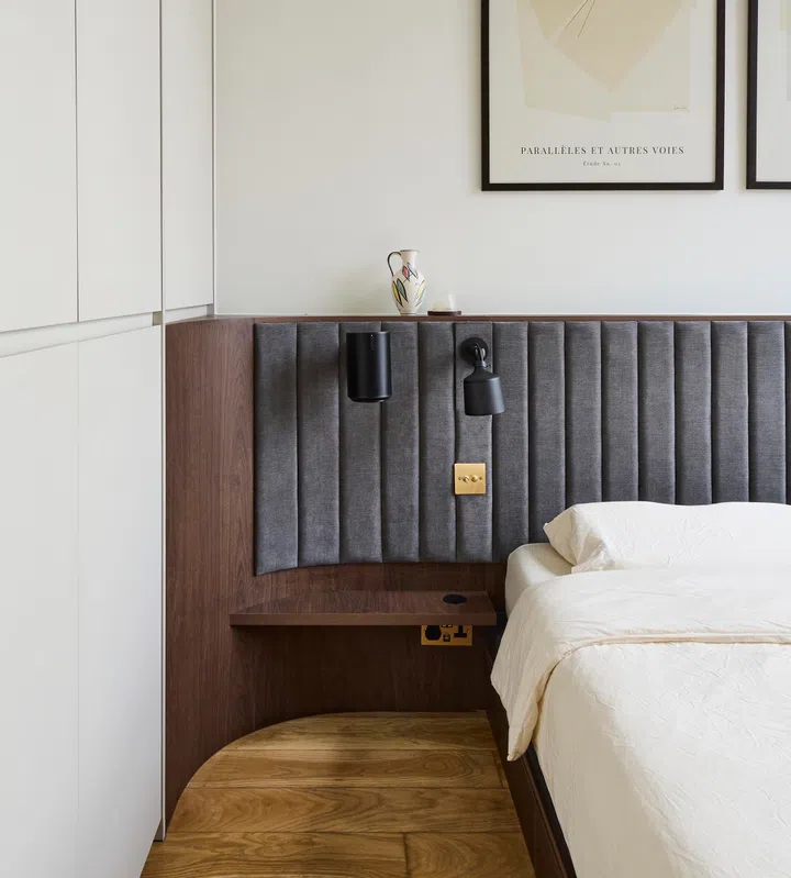 A built-in headboard was something that WL insisted on for the bedroom as he feels that a standalone bed gives a makeshift feeling. The Artistroom team designed a customised curved headboard with side tables that echo the dining banquette, integrated with uplighting. It sweeps across the bedroom to meet the new full-height, built-in wardrobes. The Tempur bed system is elevated on a low platform where WL stores his electric guitars.