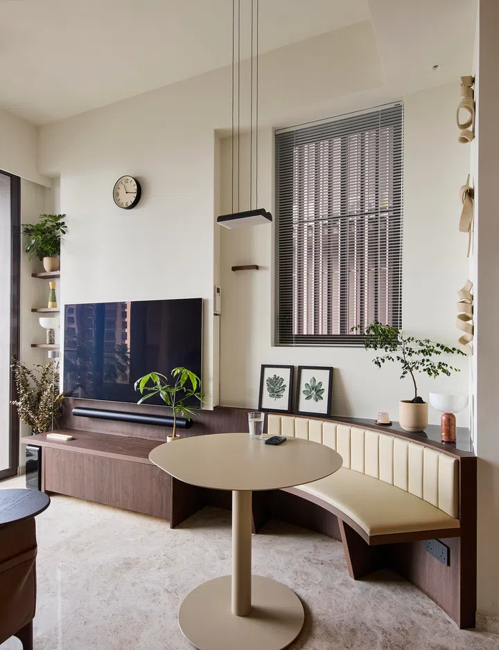 The Artistroom team relooked the existing living room layout and flipped the location of the television set to the opposite wall, which is adjacent to the dining area. Doing so allowed the dining banquette to continue into the built-in television console so that the two read as one cohesive unit. All the wires are neatly concealed and there is even a sliding compartment integrated behind the television to house WL’s PlayStation.