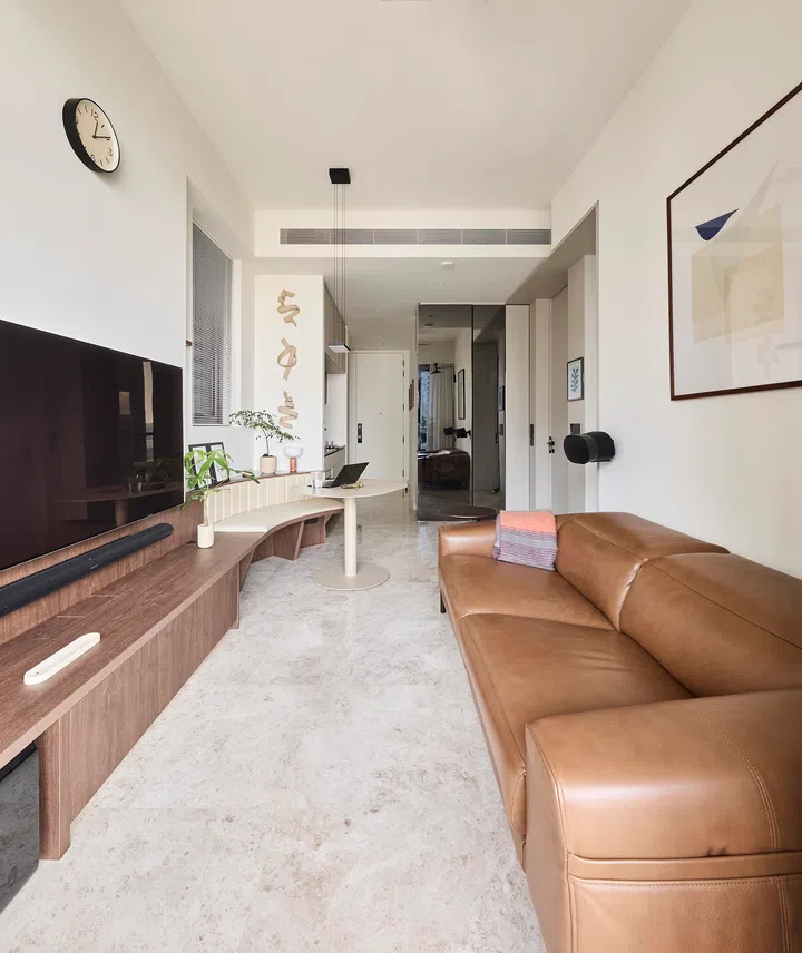 Downsizing from his former 1,200 sq ft home gave him the opportunity to declutter. As an organised person, he likes to have everything in its place and loathes seeing exposed wires and loose objects. Sharing the 527 sq ft apartment with his partner, Rachel, who is in her 40s and who works as a regional sales manager meant that they had to carefully plan for their storage needs, including space for WL’s two foldable bicycles and three electric guitars.