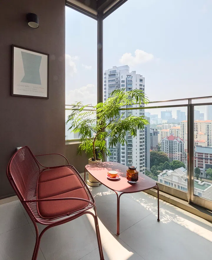 The balcony is where WL enjoys his morning coffee before starting his day. A balcony table and chair from the Hiray outdoor furniture collection from Kartell, along with plants, make this a great space for chilling while soaking in a view of the city.