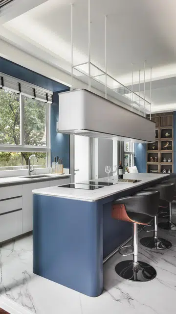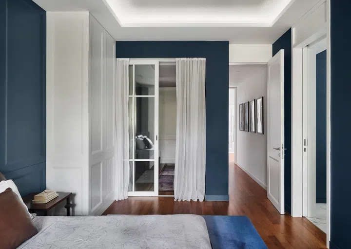 In the living room and kitchen, blue is the modern element complemented by wood with simple mouldings. As the master bedroom floor is already timber, interior designer Lawrence kept to a blue bedhead wall and white wardrobe doors in order not to overwhelm the space. Blue wall tiles and white marble in the bathrooms inject a classical feel and an air of opulence. The white cove ceilings throughout the home are not only on-theme, but also help to conceal existing beams arising from the reconfiguration of the layout.